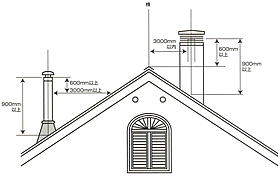 煙突トップは風圧帯を避け、3m以内の障害物から最低60cm以上立ち上げなければいけません。